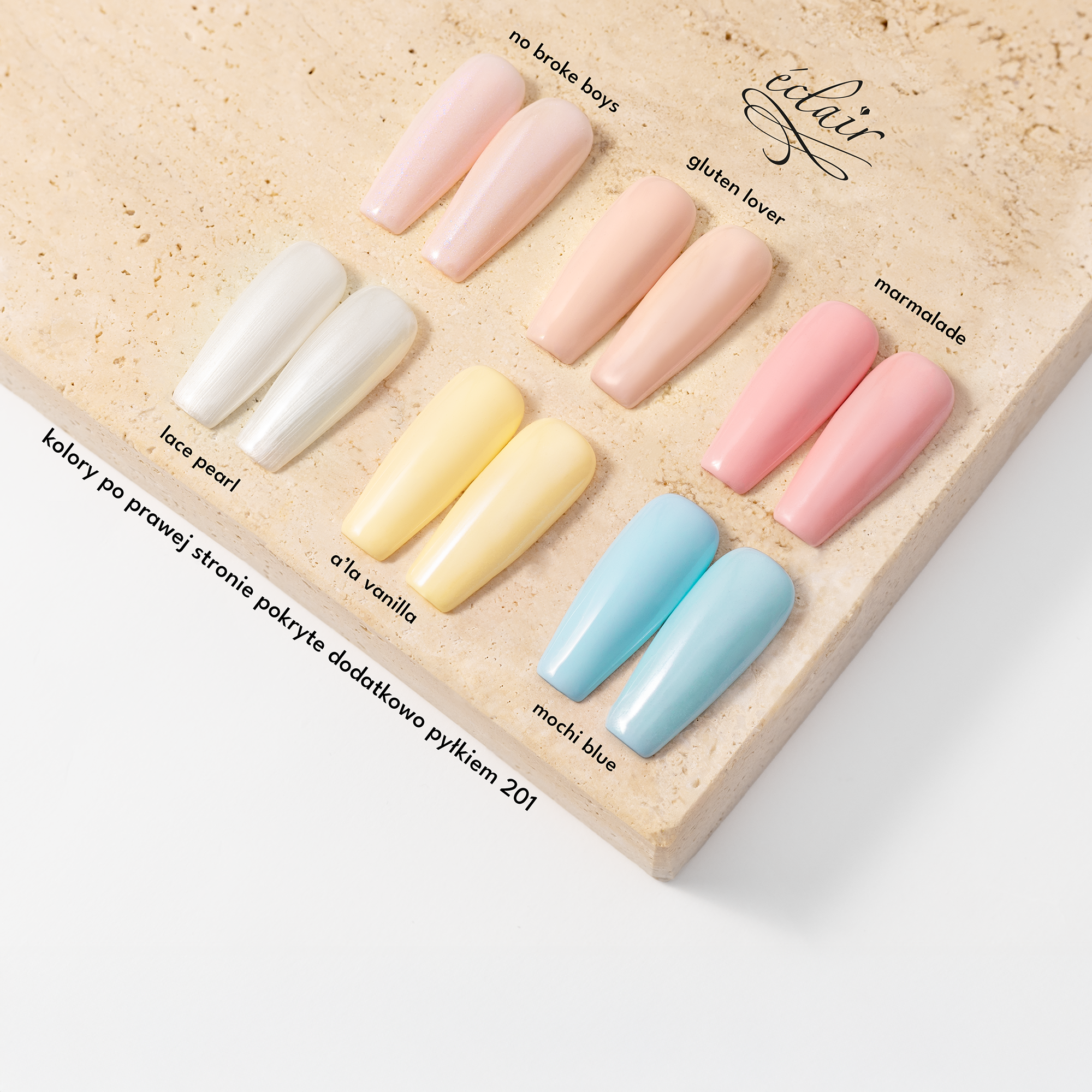 MOCHI BLUE to pastelowy błękit, który plasuje się między klasycznym baby blue a mleczną bielą – wyraźny na tyle, by nadać dłoniom charakteru, a jednocześnie wystarczająco miękki, by nie dominować stylizacji. Odcień wpisuje się w estetykę mochi – miękkiej, zaokrąglonej palety kolorów, po którą klientki sięgają, szukając czegoś słodkiego, ale nie krzykliwego. Kolor jest kremowy, nie lodowaty – to wyraźna różnica w stosunku do zimniejszych odcieni niebieskiego.