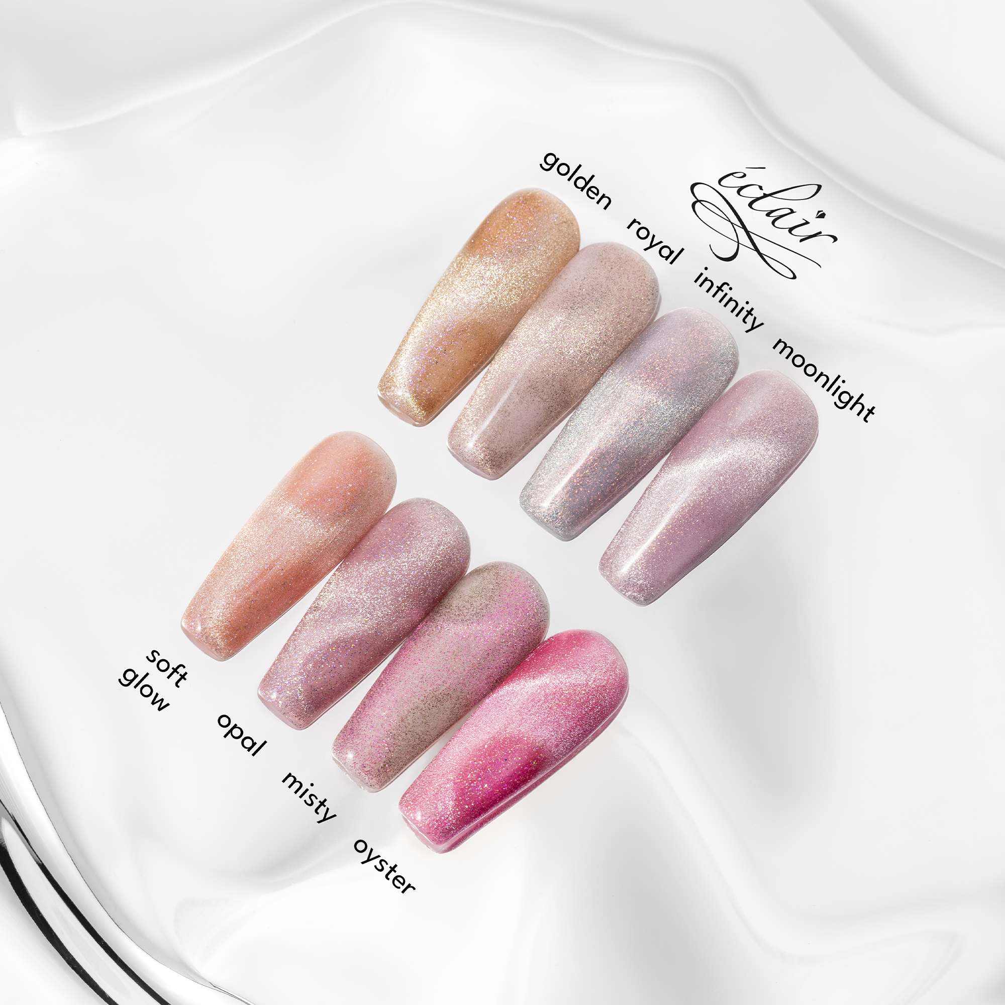 Holograficzne drobinki w OPAL dają opalizujący błysk, który zmienia się kątowo. W zależności od światła pojawiają się tony od chłodniejszych fioletów po cieplejsze złoto. Wykończenie cat eye dodaje magnetyczną smugę, dzięki czemu refleks ma kierunek i wygląda bardziej uporządkowanie, a nie jak przypadkowe migotanie.