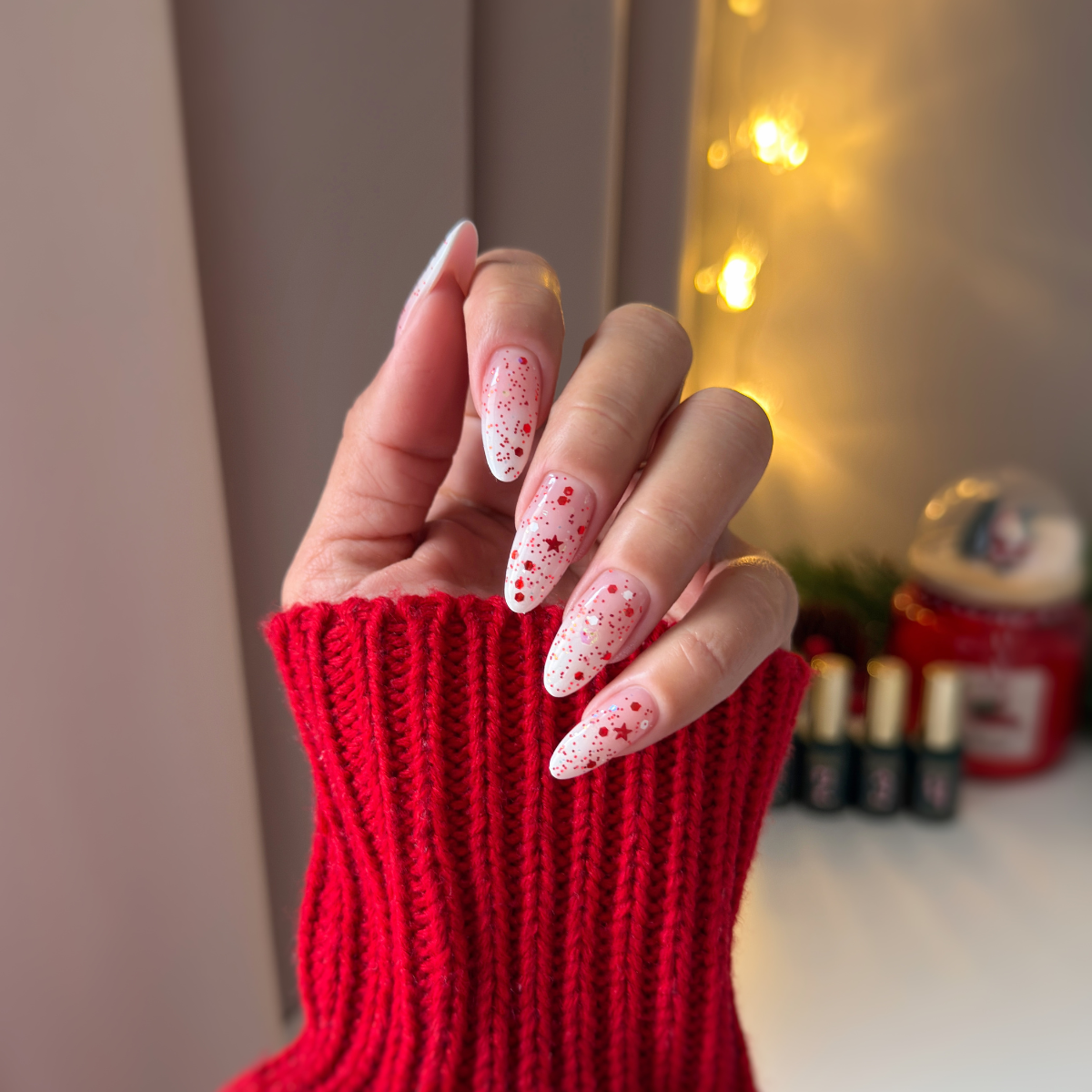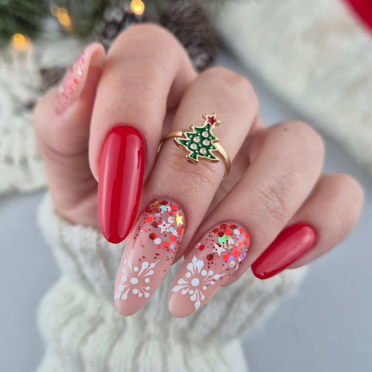 To klasyka świąt w najczystszej postaci. Ciepła czerwień, połyskujące drobinki i delikatne gwiazdki zatopione w przezroczystym topie tworzą efekt, bez którego grudzień nie byłby grudniem. Bo umówmy się, bez czerwieni nie ma świąt.